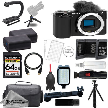 Sony ZV-E10 Mirrorless Camera (Black) + 64GB + Extra Battery+ LED Flash- ULTIMATE Kit
