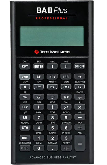 The BA II Plus Professional calculator features all the great features of its predecessor while packing in even more time-saving functions to make short work of complex equations. It's an ideal choice for entry level and advanced finance, accounting, economics, investment, statistics, and other business classes. It's also a great choice to bring to the Chartered Financial Analyst (CFA) exam. Along with the standard capabilities of time-value-of-money, accrued interest, amortization, cost-sell-margin, and depreciation calculations, users can calculate more advanced business and finance related issues. It will handle net future value (NFV), modified internal rate of return (MIRR), modified duration, payback, discount payback, and more. Its rugged metal exterior, firm-touch keypad and anti-slip rubber feet make it ideal for anyone in accounting, economics, investing, statistics, and related businesses.Texas Instruments BA II Plus Professional Calculator Specifications