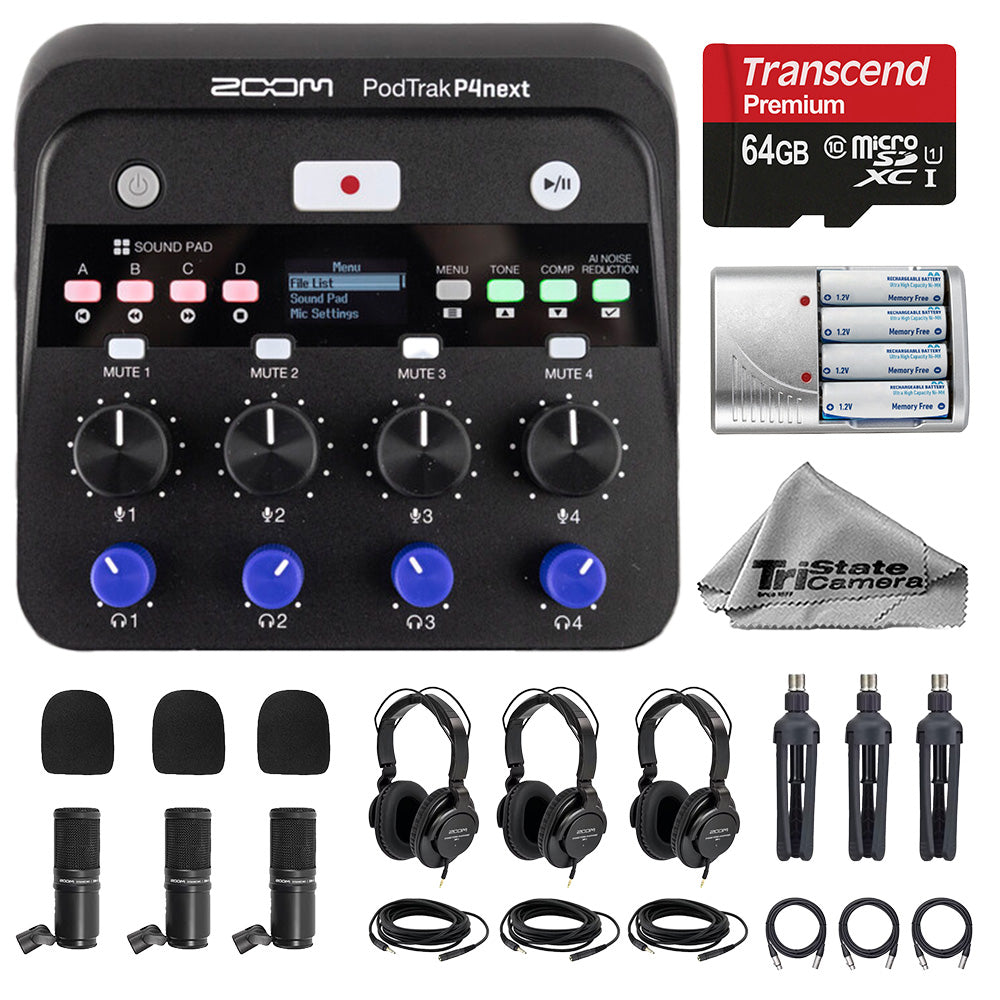 Zoom PodTrak P4next Portable Multitrack Podcast Recorder w/ ZDM-1 Podcast Microphone 3 Pack +64GB Kit
